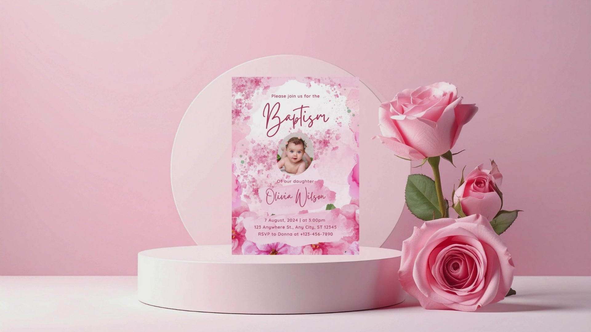 Celebrate your little one’s special day with this Pink Floral Baby Baptism Invitation Template — a beautifully designed, editable digital invite perfect for baby girls. Featuring soft pink florals and elegant typography, this invitation is ideal for baptisms, christenings, and naming ceremonies.